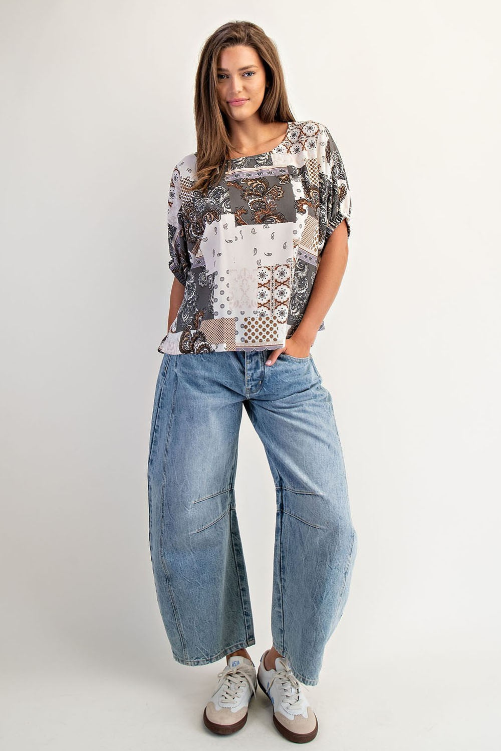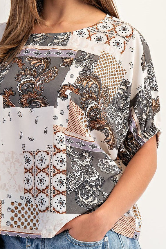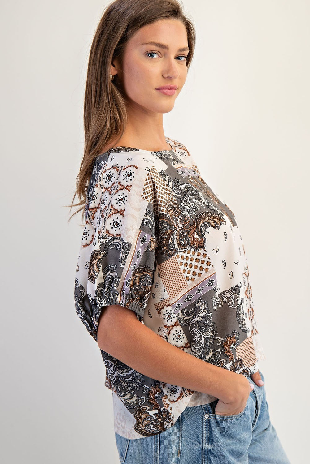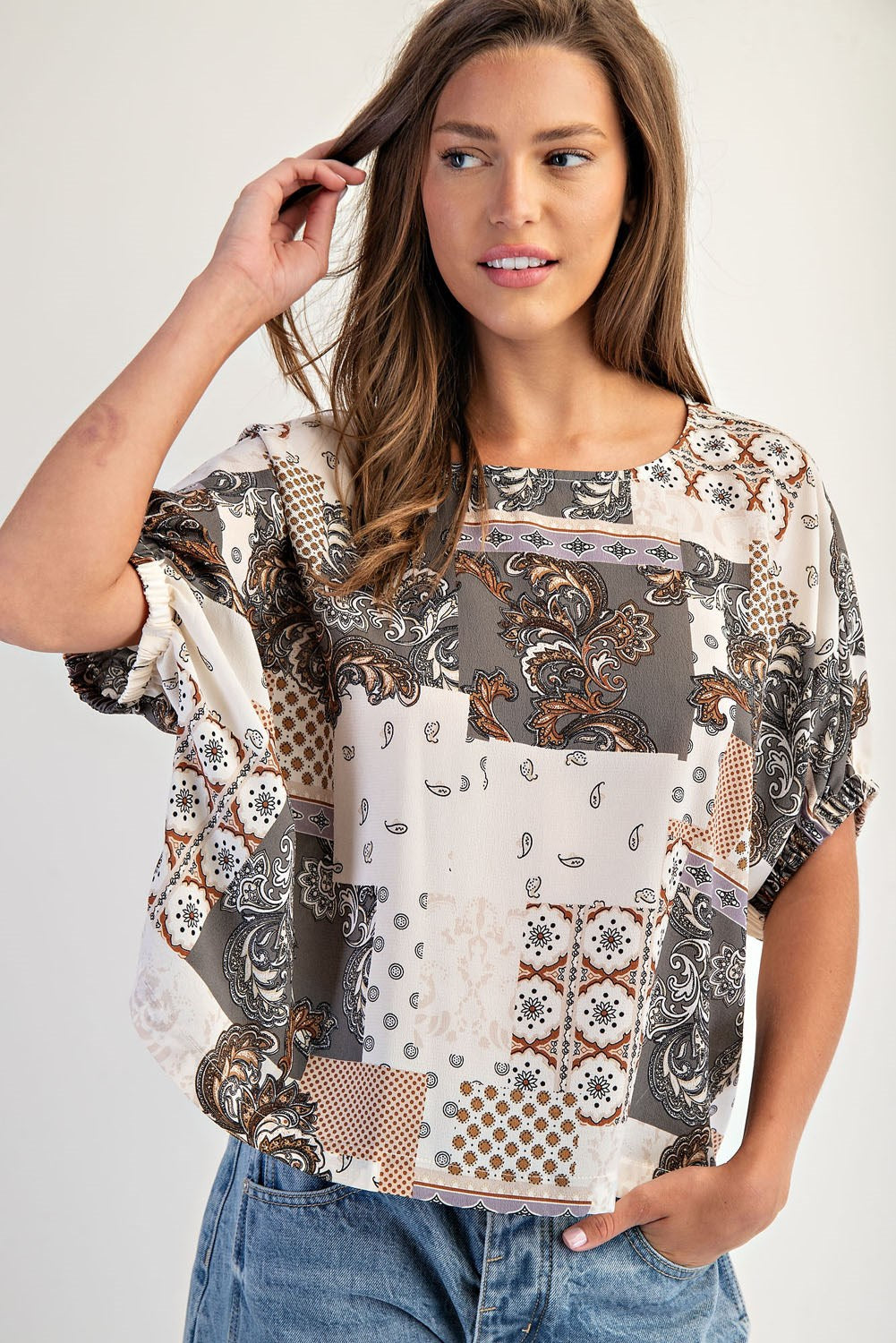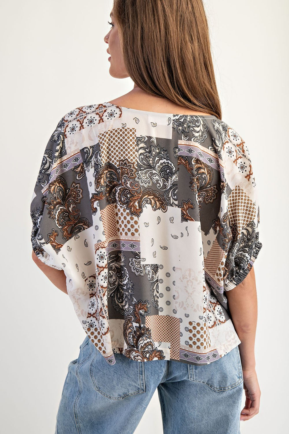 This printed blouse brings together bandana and patchwork bandana-inspired motifs in a mix that feels artful and easygoing. Designed with a relaxed, boxy silhouette, it features a wide scoop neckline and gathered dolman sleeves with elastic cuffs for a soft, breezy drape. The lightweight fabric flows beautifully, making it perfect for warm days or layered looks. With its mix of misty grays, soft browns, and ivory tones, this top’s vintage charm adds a boho chic touch to any outfit—just right for dressing up denim or pairing with crisp whites.