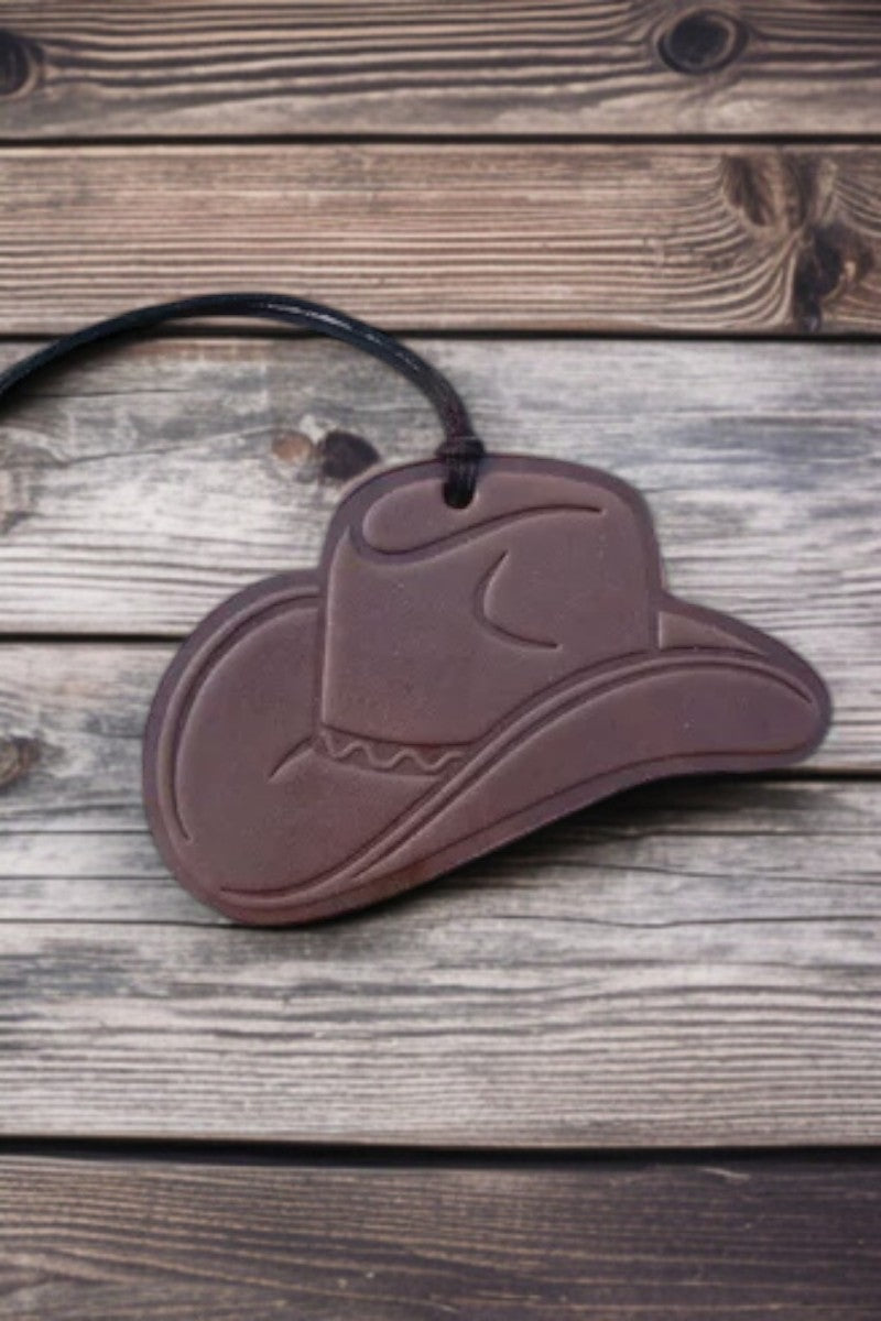Die cut in the shape of a cowboy hat and embossed with details, this air freshener is handmade from 100% full grain vegetable tanned leather. They are infused with premium fragrance oil, releasing a lasting scent to awaken the senses.