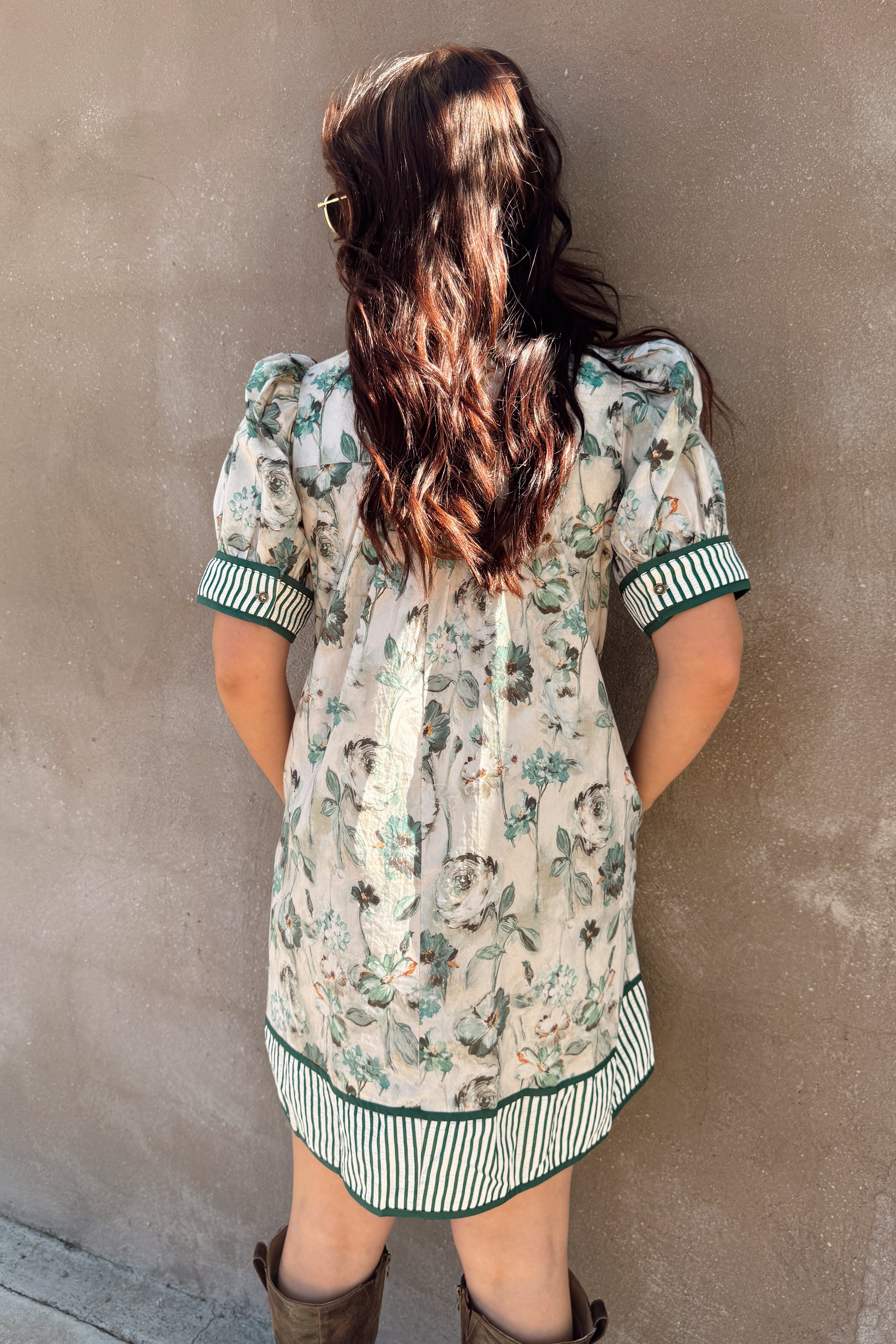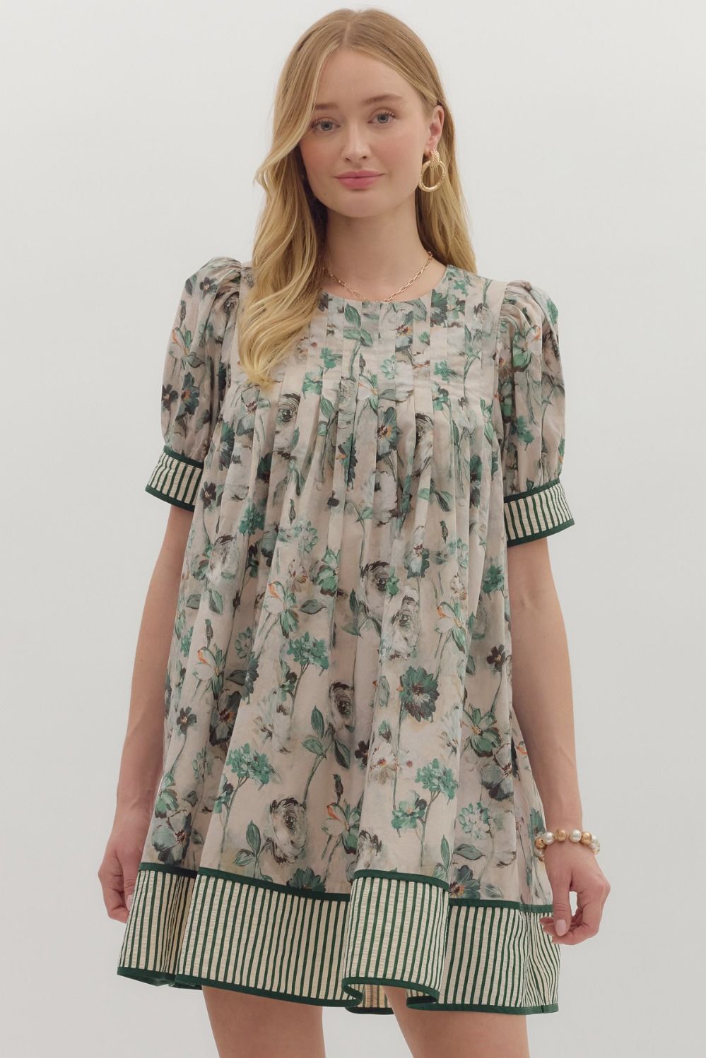 Earthy, easy, and full of charm. This pleated cotton dress features a soft floral print in deep greens and muted tones, set against a light beige background that keeps things breezy. The short puff sleeves are finished with a striped cuff band that adds a playful contrast, echoed again at the striped hem for a subtle pop. A single button keyhole closure at the back neck adds a delicate detail, while side pockets bring in everyday practicality. Made from 100% cotton, the fabric is lightweight, woven, and fully lined, with a relaxed fit that moves easily and layers well. It’s a piece that feels casual but thoughtful—perfect for warm days or early fall.