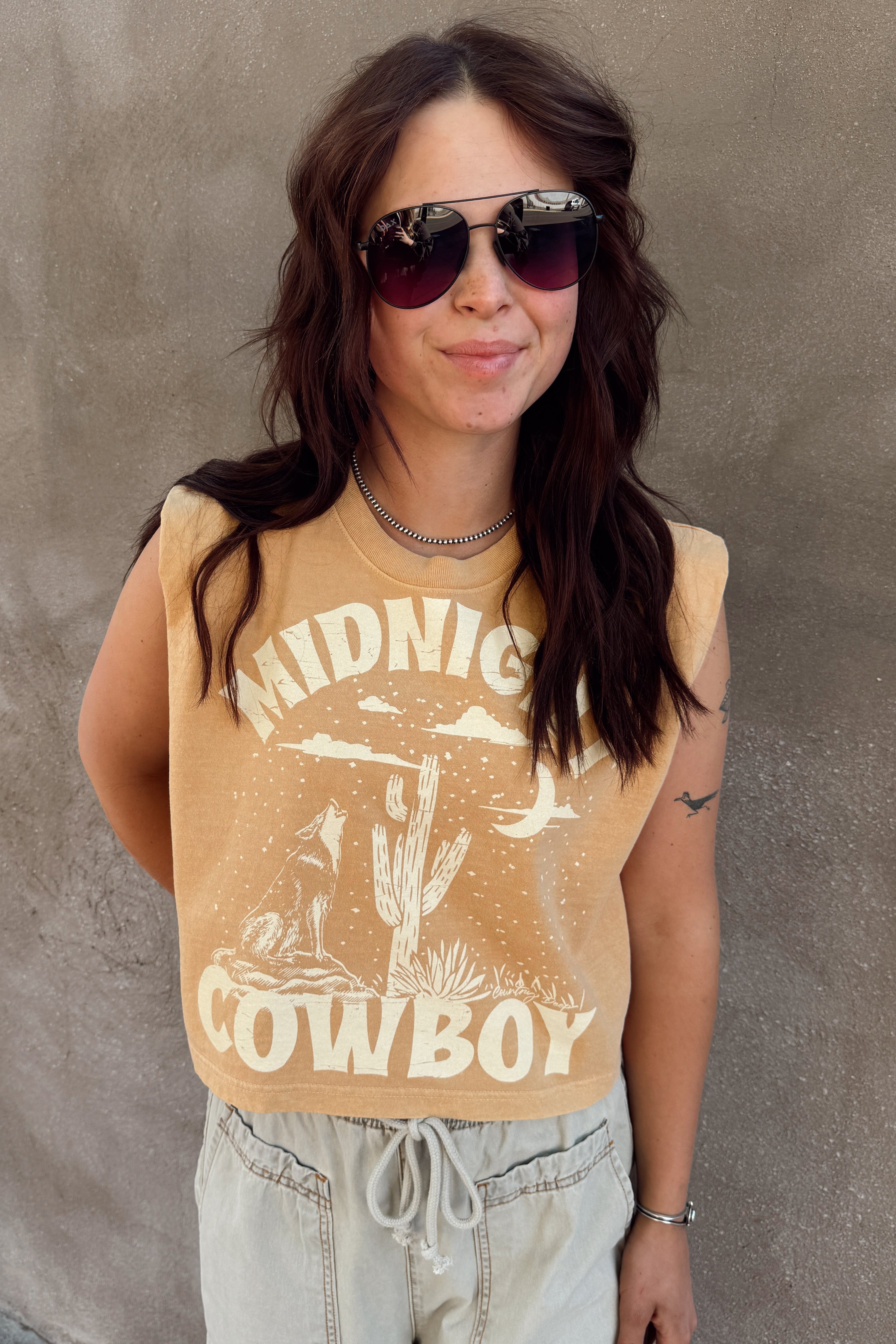 Bold “Midnight Cowboy” graphic on muted, earthy mustard base, giving a western-inspired pop of personality