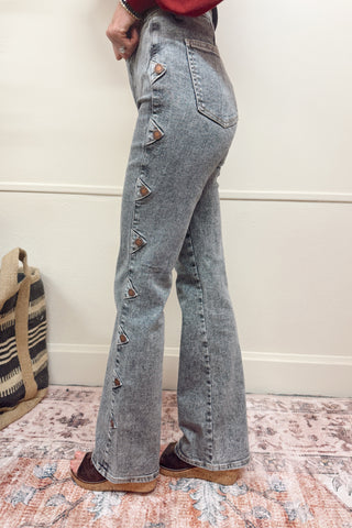 Person wearing blue flared jeans with a white wall and textured rug in the background