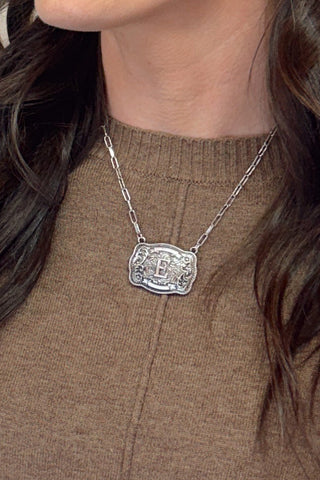 A silver-colored western belt buckle style necklace with the initial 'K' displayed on a black stand.