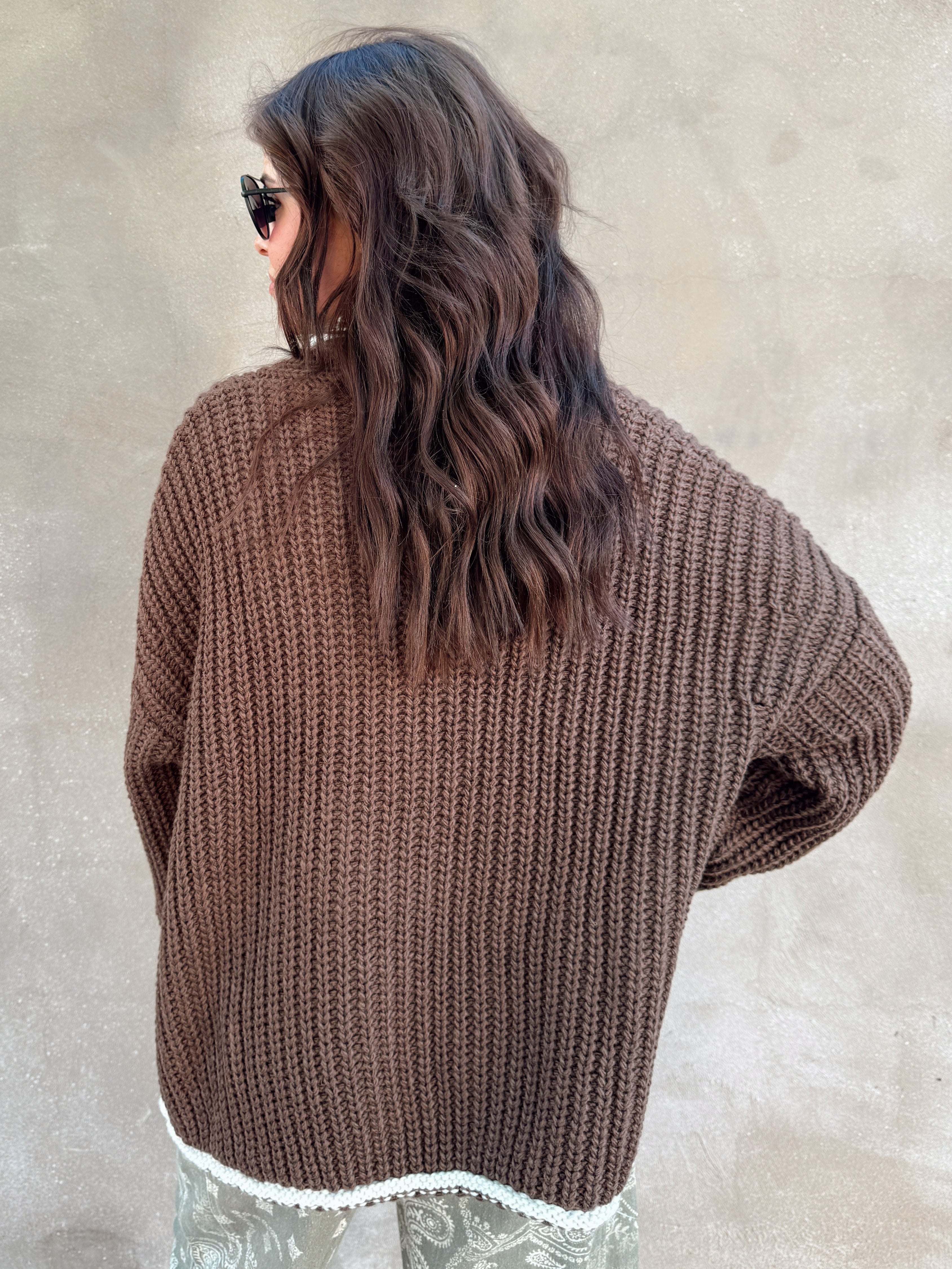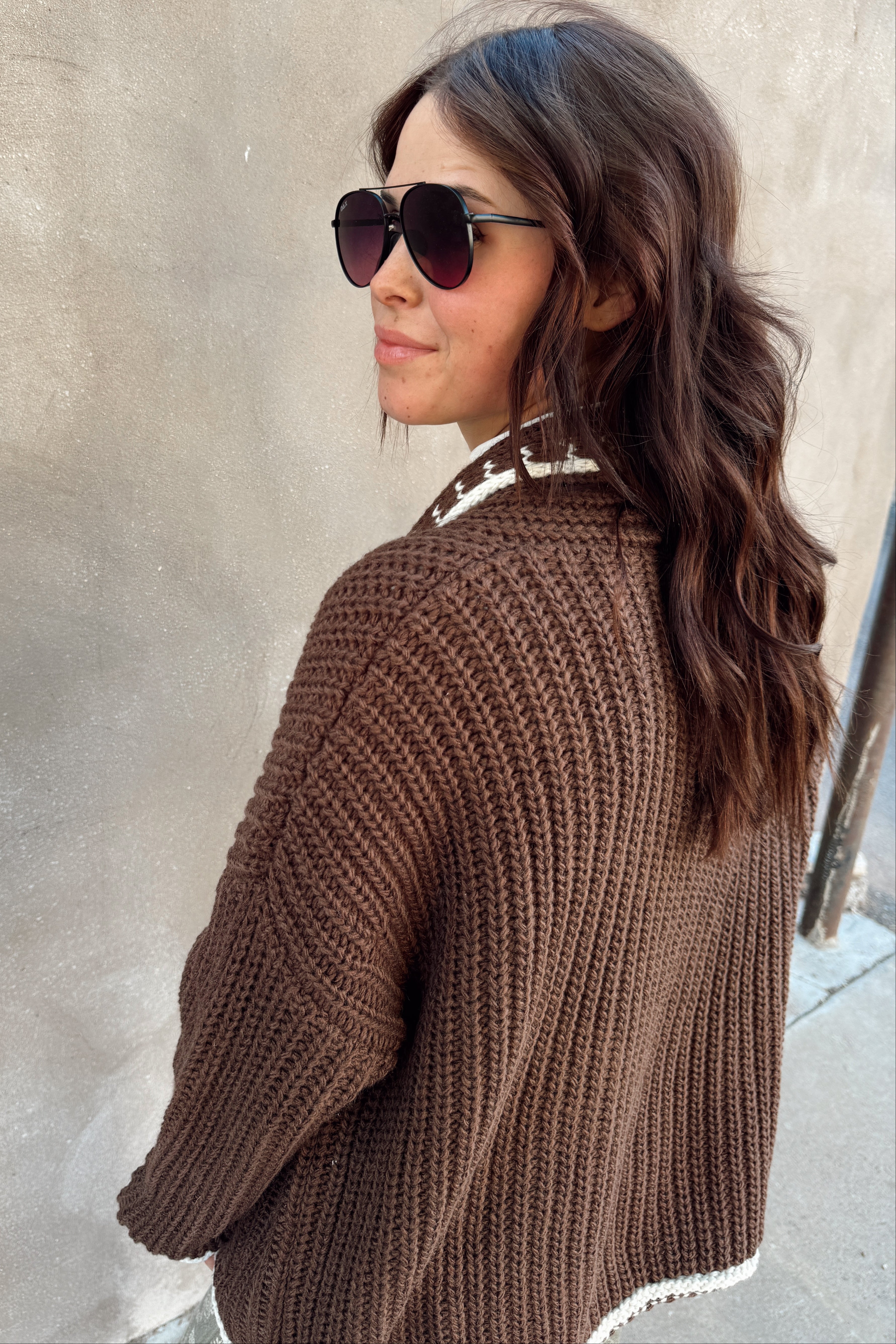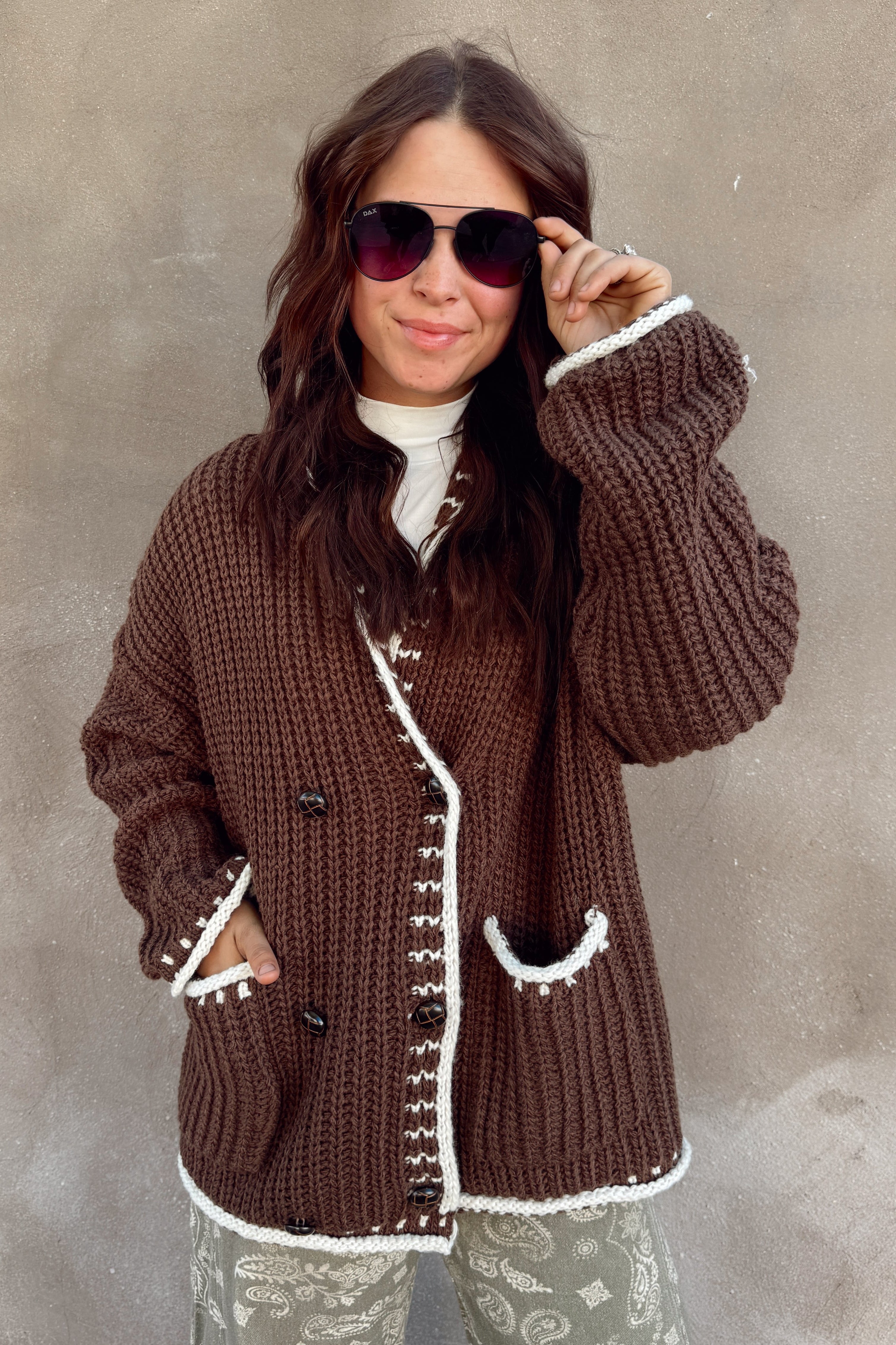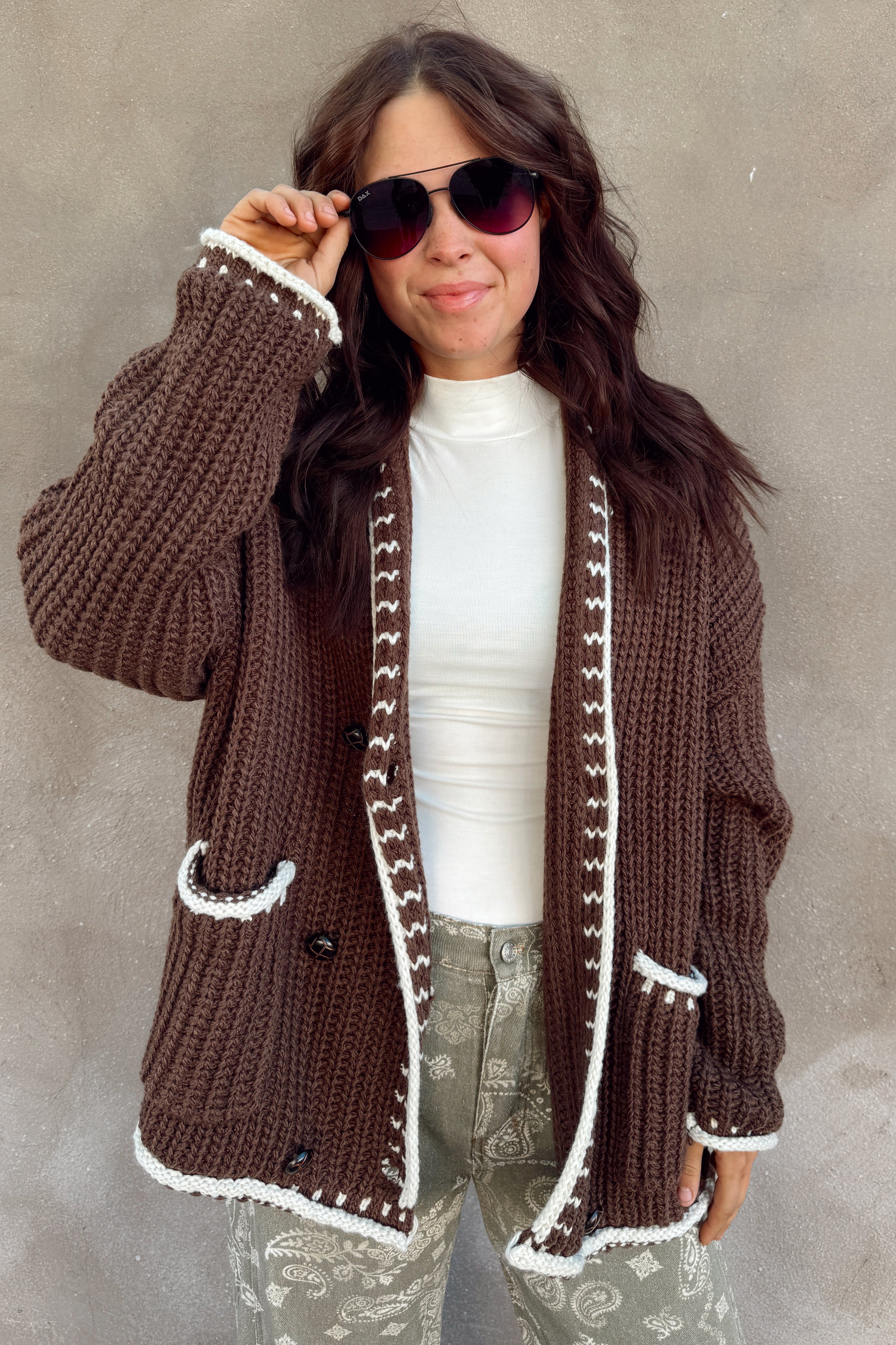 This chunky knit oversized cardigan in rich brown is your layering hero — soft, substantial, and styled with a little boho flair. Crafted from heavyweight yarn, it drapes generously with dropped shoulders and an easy‑slouch silhouette that feels relaxed but pulled‑together. Bold contrast trim edges the shawl collar and button‑down front, while deep patch pockets anchor the look, practical and stylish. The warm brown tone is earthy and versatile, pairing effortlessly with denim, skirts, or your favorite booted looks. Whether you’re cozying up or stepping out, this cardigan gives you casual comfort with curated detail.