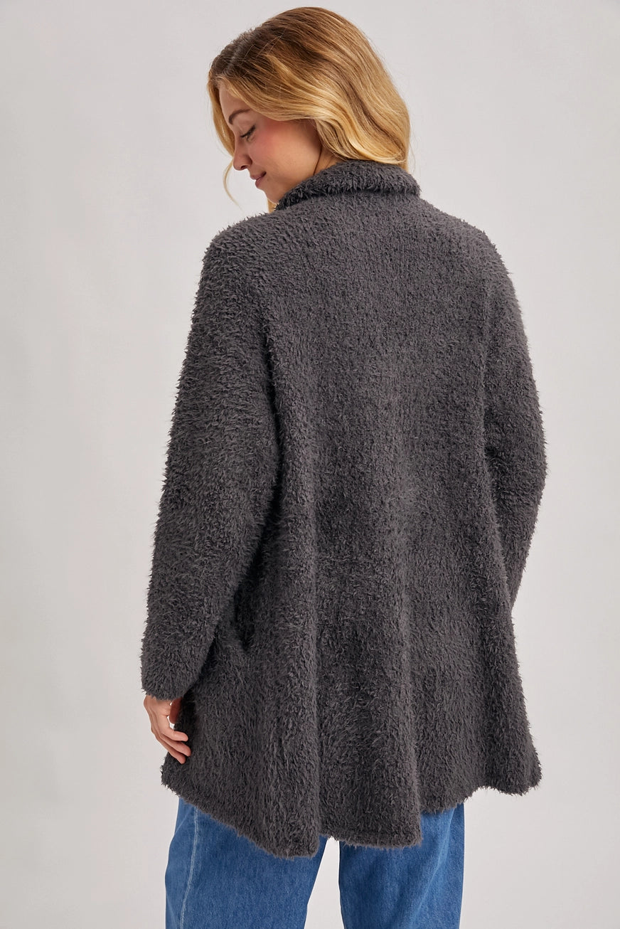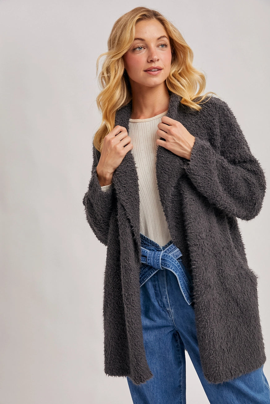 This cardigan feels like wrapping up in your favorite blanket but looks effortlessly put-together. The soft, fuzzy texture gives it that lived-in luxury you’ll want to wear every day. It features a relaxed, draped collar and roomy dolman sleeves that add an easygoing, flowy fit. The side pockets are the cherry on top — perfect for keeping your hands cozy or stashing your phone. Pair it with denim, leggings, or even loungewear — it’s that versatile “throw-on-and-go” piece you’ll keep reaching for.