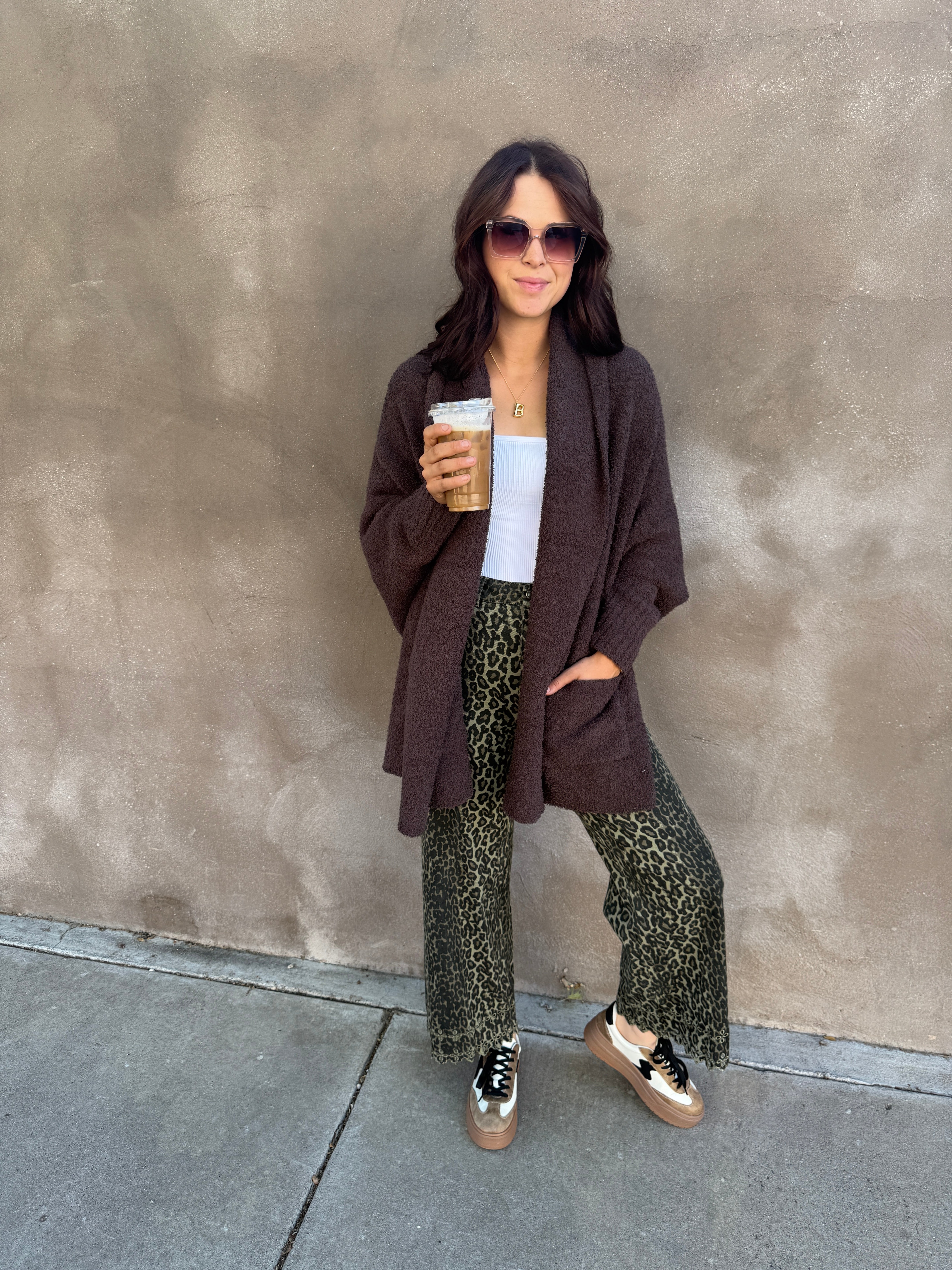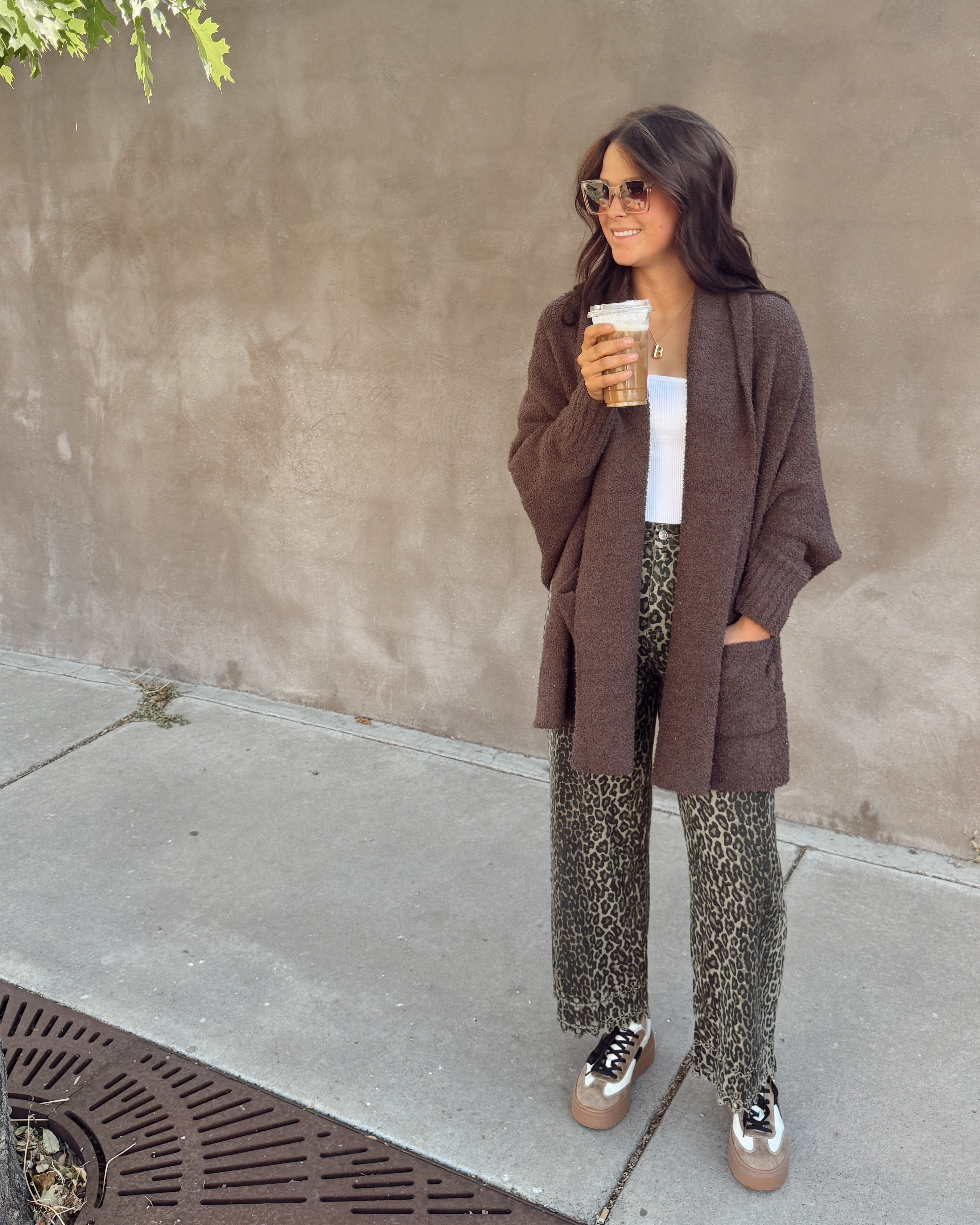 Wrap yourself in cozy sophistication with this statement cardigan-wrap. Made from a super-soft boucle knit in a rich brown, it's plush, comfy, and effortlessly chic. The open-front design features a wide shawl collar that drapes beautifully, and two handy front patch pockets add a practical touch. Its poncho-inspired silhouette gives a dramatic, flowing look with an asymmetrical hem that’s longer at the sides — all while keeping the fitted long sleeves you love for easy layering. Perfect for cooler days, this piece is your go-to for staying warm in style.