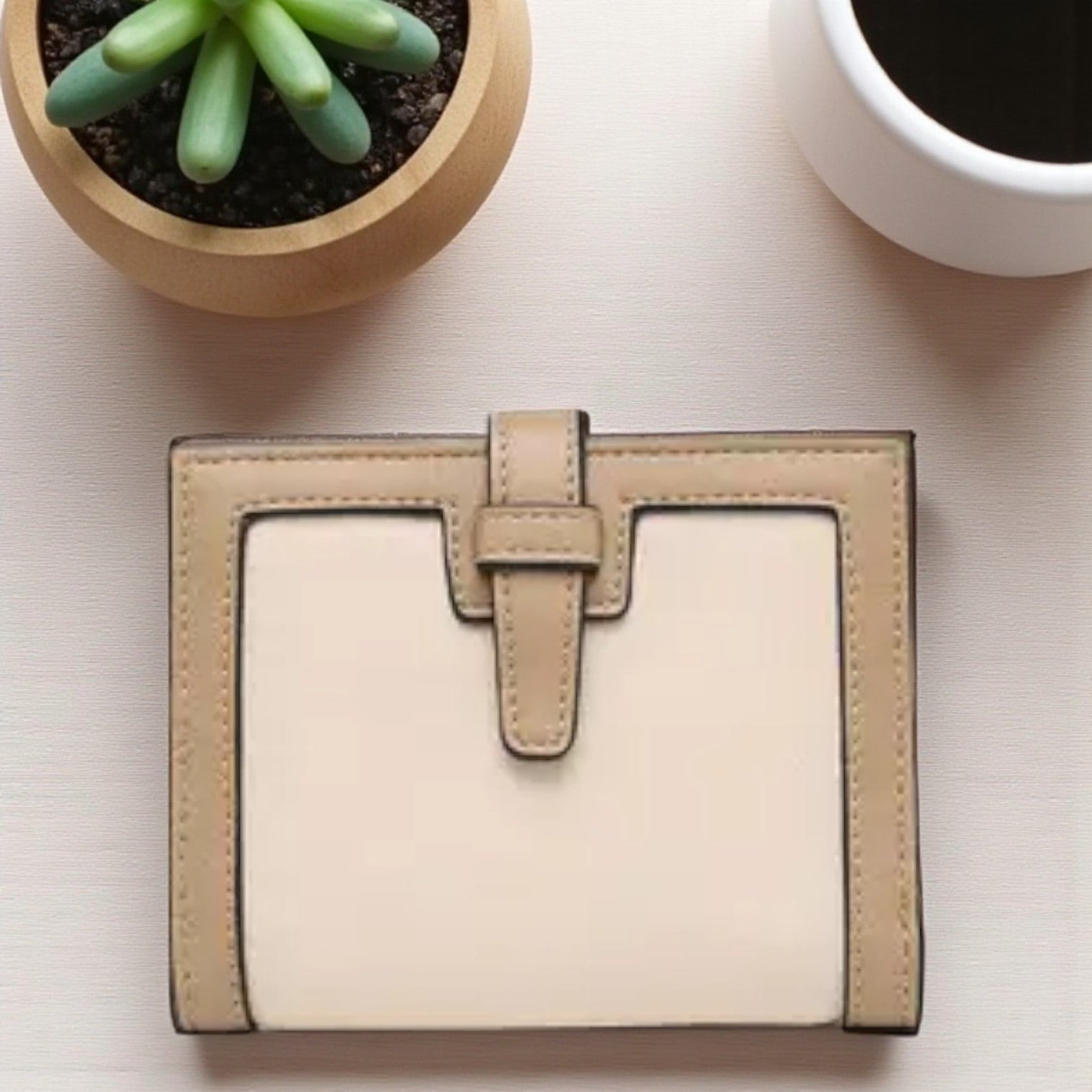 This wallet is the perfect blend of style and function! The bifold design and slip closure make is super convenient for every day use, and inside you'll find multiple pockets offering plenty of room for your cards and cash. The two toned vegan leather in soft neutrals adds a modern flair to your daily style and compliments any bag or outfit.