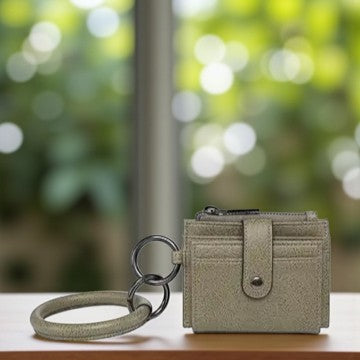 This vegan leather card holder style wallet offers compact storage for all of your essentials! It has a top zipper pocket for securing cash and change, plenty of card slots, and a fold out ID holder for easy access. The ring bangle lets you wear it as a wristlet or attach it to your favorite handbag.